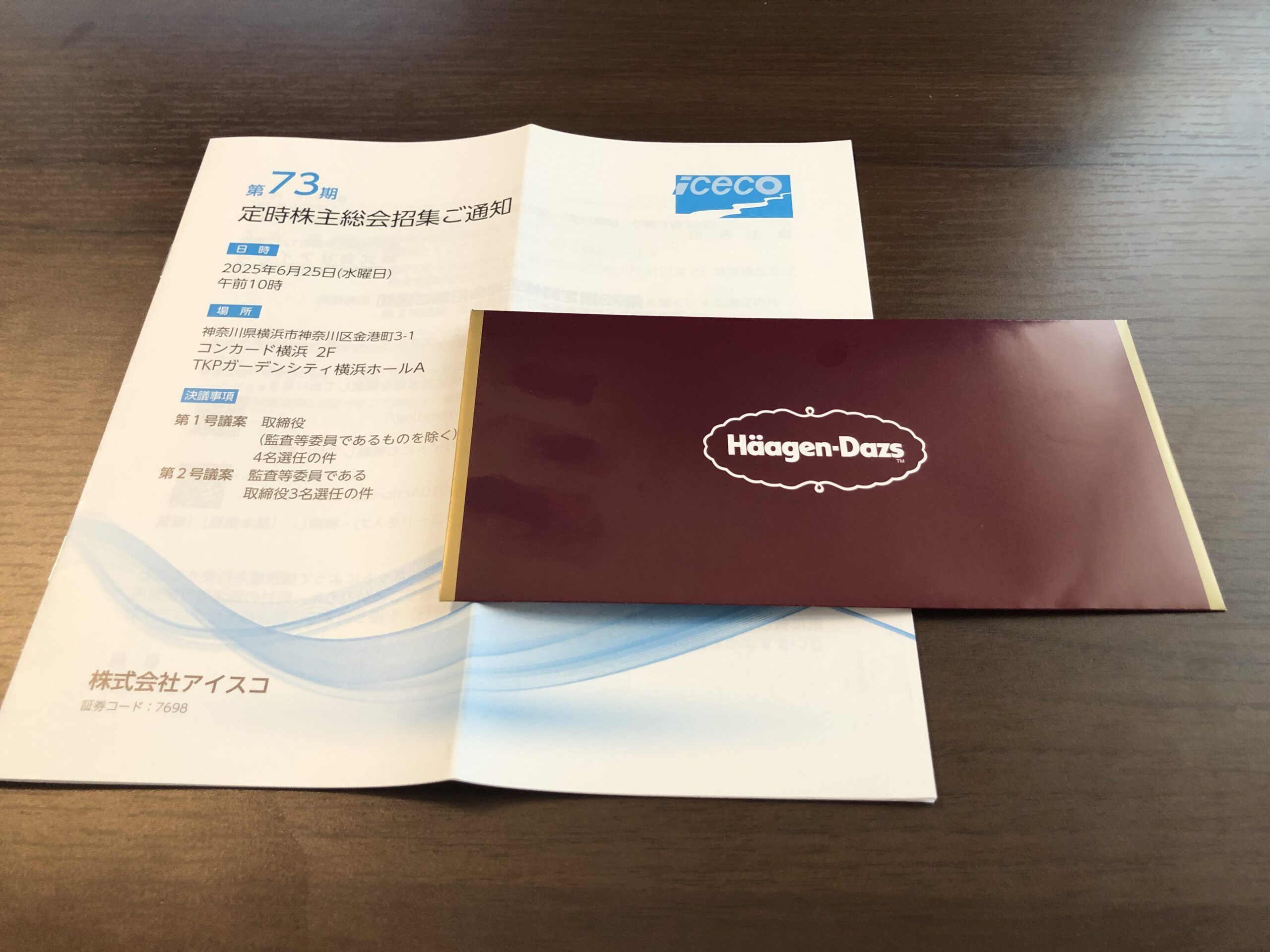 アイスコ (7698) の株主優待は、年二回、100株以上一律で「ハーゲンダッツ」ギフト券4枚いただけます。