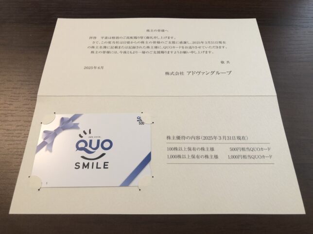 前回、2024年の時は、株主総会終了後の案内に同封されましたが、今年は、株主総会招集通知に同封されてきました。100株なので500円相当のクオカードです。
