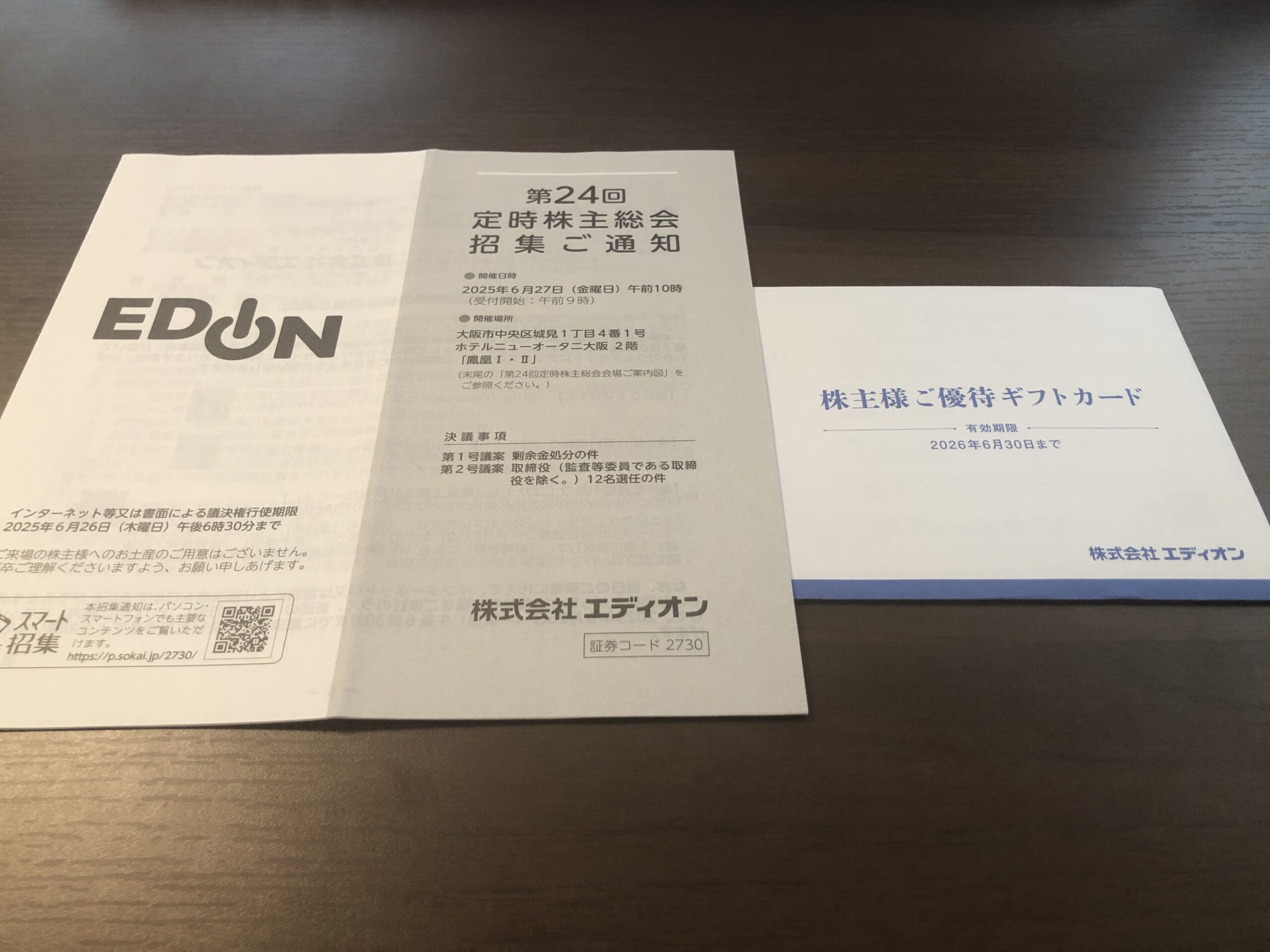 エディオン (2730)より2025年6月9日に定時株主総会招集通知と共に 株主優待 が届きました。