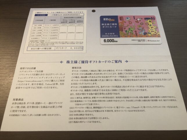エディオン (2730) の株主優待は、年一回期末期となります。自社ギフトカードがいただけます。