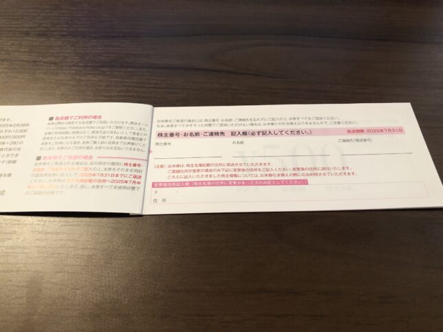 内容としては、例年通りです。100株以上500株未満の為、500円券が2枚1000円相当です。有効期限は、1年後の2026年5月31日までです。必要事項を記入して送り返すとお米券と交換可能です。店舗が関東にのみとなるのでその他の地域の方は、お米券の交換になりますが、利回りが悪くなります。交換期限は、2025年7月31日までです。7月中旬より順次発送されます。