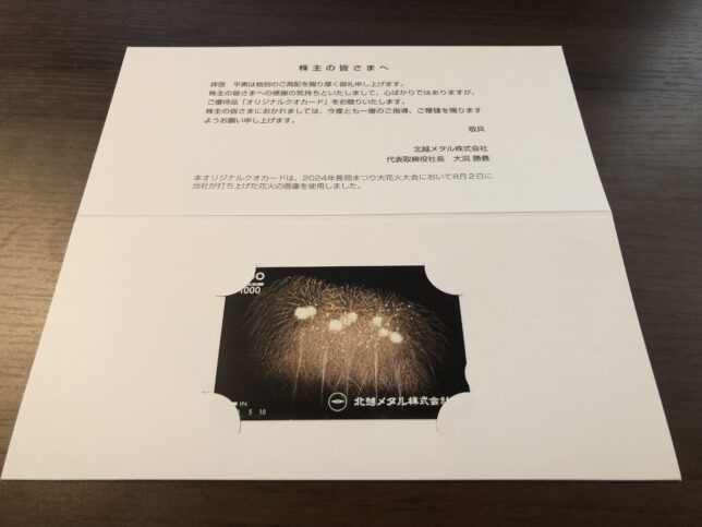 100株以上一律で頂ける1000円相当のオリジナルクオカードです。毎年図柄が変わるようですが、毎年同じ花火大会なのでほぼ同じように見えます・・・