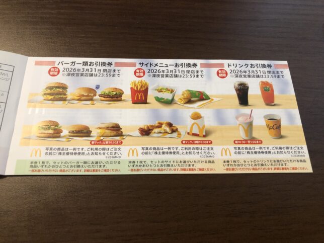 日本マクドナルドHD(2702) は、12月決算銘柄で、年二回お食事券が頂けます。1冊6枚つづりで単純に月に1食いただける感じです。有効期限は、2026年3月31日までとなります。