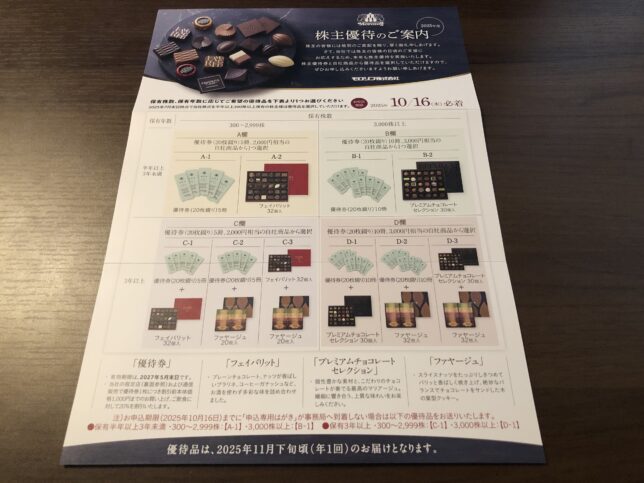 モロゾフ (2217)は、1月決算銘柄で中間となる7月末保有者に株主優待ギフトが頂けます。株主優待ギフトは、選択制で割引券または、ギフトの二択です。3年以上の長期になるとギフトが2つに増えて、割引券を含めて2つ選ぶことが出来て3通りの選択肢があります。