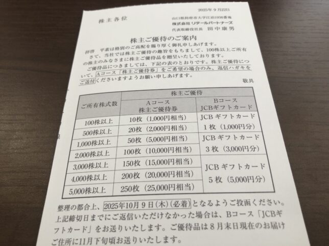 買物優待券を希望する場合は、10月9日までにはがきを返信する必要があります。11月下旬ごろに届く予定です。