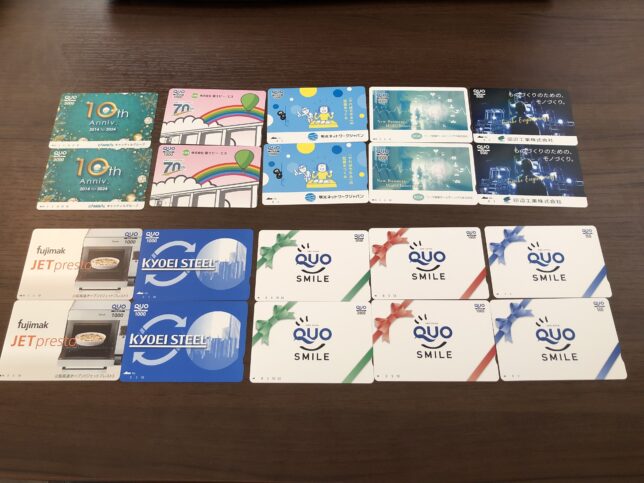株主優待の定番クオカード 2024年の一年間に頂いた総額は、なんと10万円に達しました。トランプのように神経衰弱が出来そうなくらいあります。額面だと1000円券が多かったです。優待額が3000円でも3000円1枚ではなく1000円を三枚にするところもありますからね。特に長期優待でありがちな感じです。